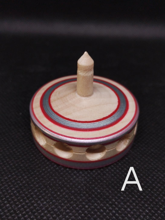 Toupie pouvant être retournée entre les 2 doigts de la main, index-pouce, en pleine rotation.